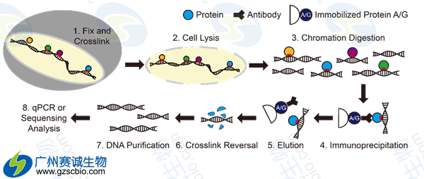 如上圖所示,細胞裂解液里的蛋白和相關染色質(zhì)暫時結(jié)合;DNA-蛋白復合物被剪切,與所研究蛋白相關的DNA片斷被選擇性免疫沉淀;相關DNA片斷被純化,順序被測定。